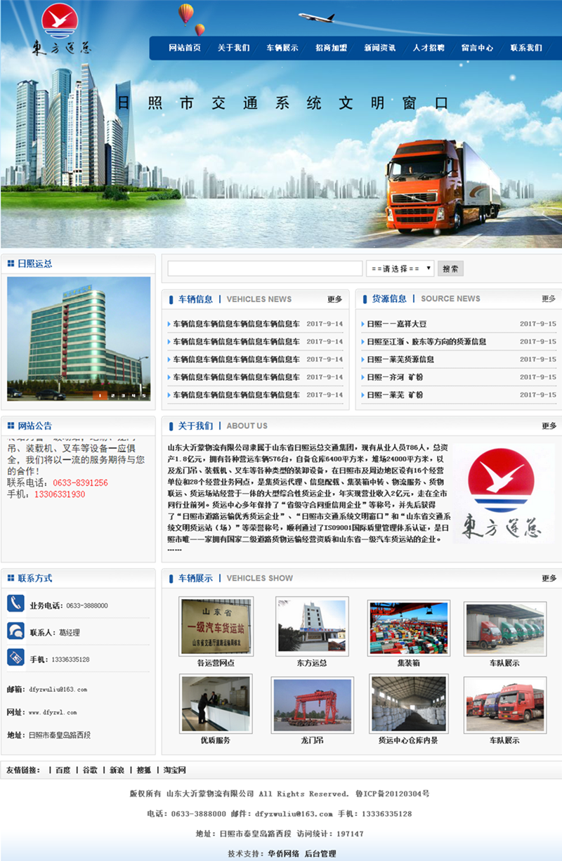 山東大沂蒙物流有限公司隸屬于山東省日照運總交通集團,現(xiàn)有從業(yè)人員786人,總資產(chǎn)1.8億元,擁有各種營運車輛576臺,自備倉庫6400平方米,堆場24000平方米,以及龍門吊、裝載機、叉車等各種類型的裝卸設(shè)備,在日照市及周邊地區(qū)設(shè)有16個經(jīng)營單位和28個經(jīng)營業(yè)務(wù)網(wǎng)點,是集貨運代理、信息配載、集裝箱中轉(zhuǎn)、物流服務(wù)、貨物聯(lián)運、貨運場站經(jīng)營于一體的大型綜合性貨運企業(yè),年實現(xiàn)營業(yè)收入2億元,走在全市同行業(yè)前列。貨運中心多年保持了“省級守合同重信用企業(yè)”等稱號,并先后獲得了“日照市道路運輸優(yōu)秀貨運企業(yè)”、“日照市交通系統(tǒng)文明窗口”和“山東省交通系統(tǒng)文明貨運站(場)”等榮譽稱號,順利通過了ISO9001國際質(zhì)量管理體系認(rèn)證,是日照市唯一一家擁有國家二級道路貨物運輸經(jīng)營資質(zhì)和山東省一級汽車貨運站的企業(yè)。